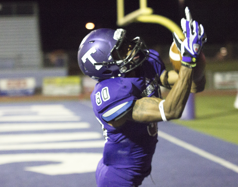 Le’Nard Meyers TD catch 2ndQ Le’Nard Meyers hauls in one of his two touchdown catches Saturday, tying him with Stephenville product Jeremy Madkins for second all time in a Tarleton career with 25. || Photo by CHET MARTIN Like this:Like Loading...